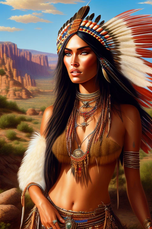 A picture of native american woman, megan fox face, in wild west environment, rocky canyon, wears feather accessories and feather headdress, wide view, (realistic shading:0.8), raytracing, (intricate), (highly detailed textures), depth of field, realistic lighting, soft ambient lighting, dusk, 8k, art by greg rutkowski and alphonse mucha